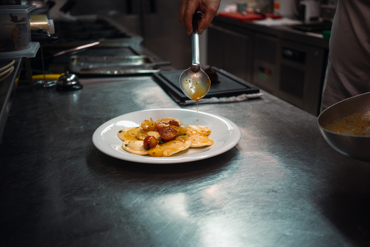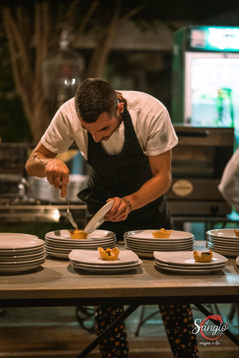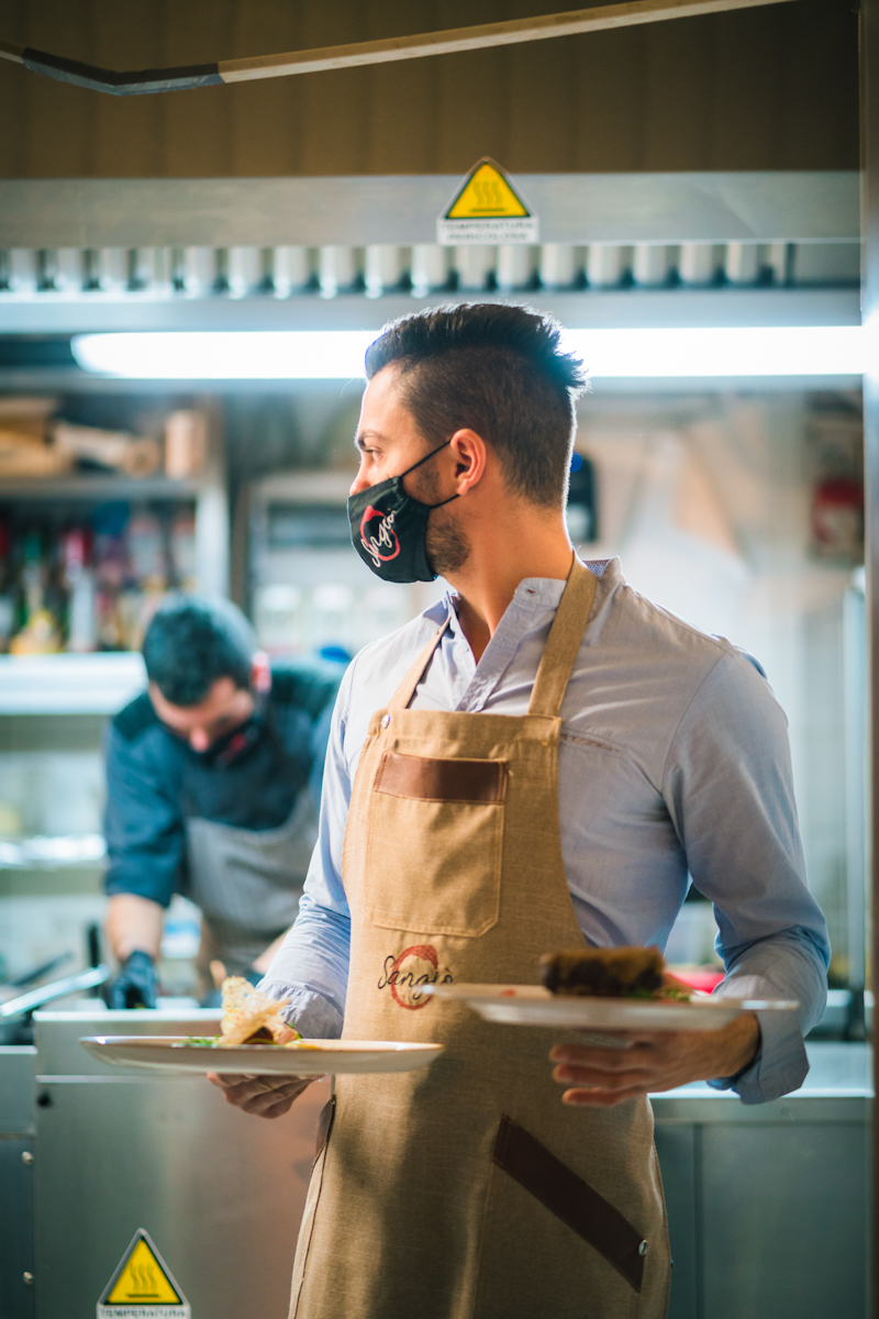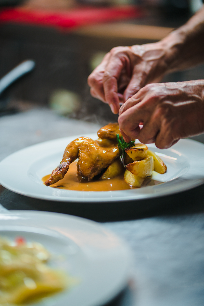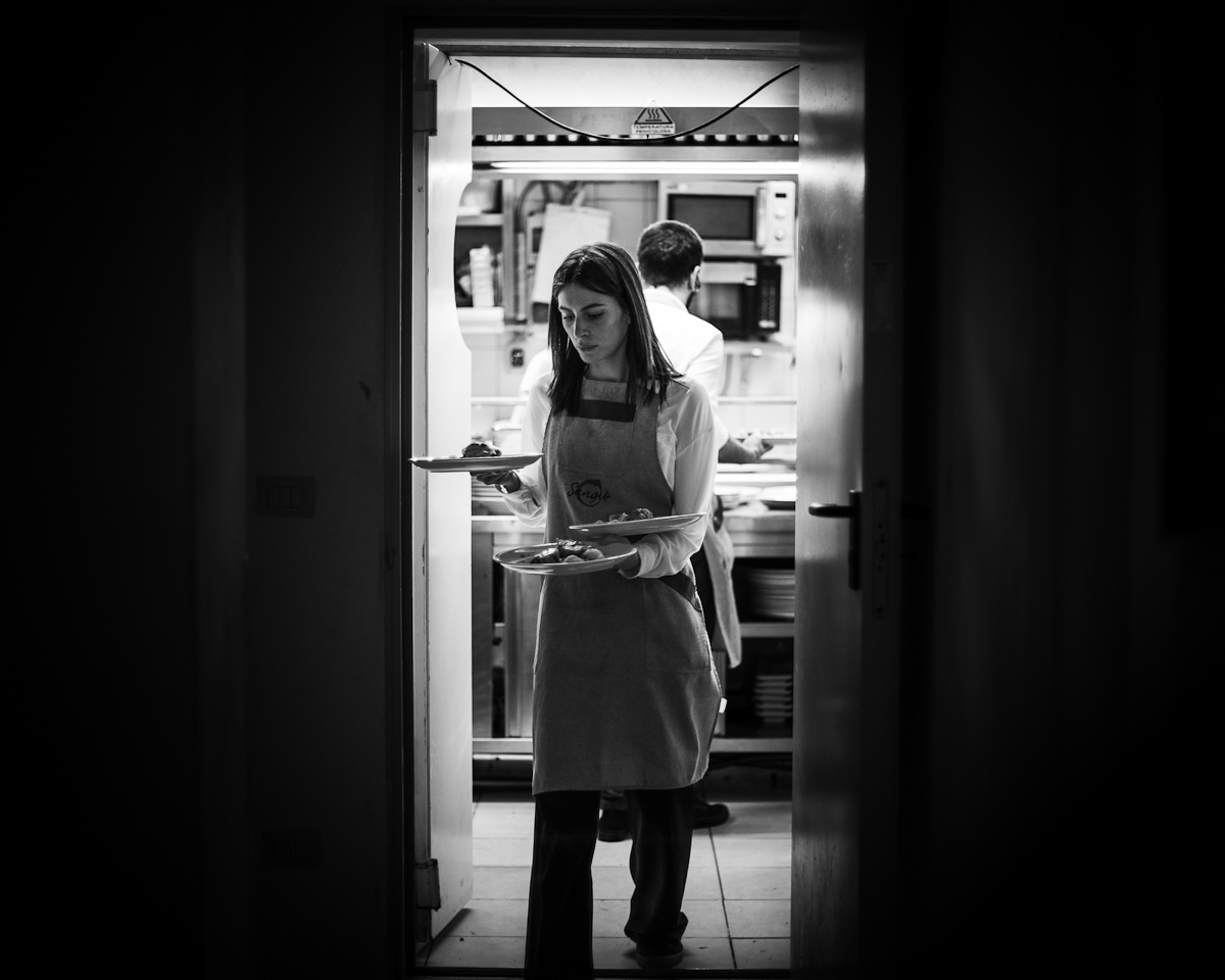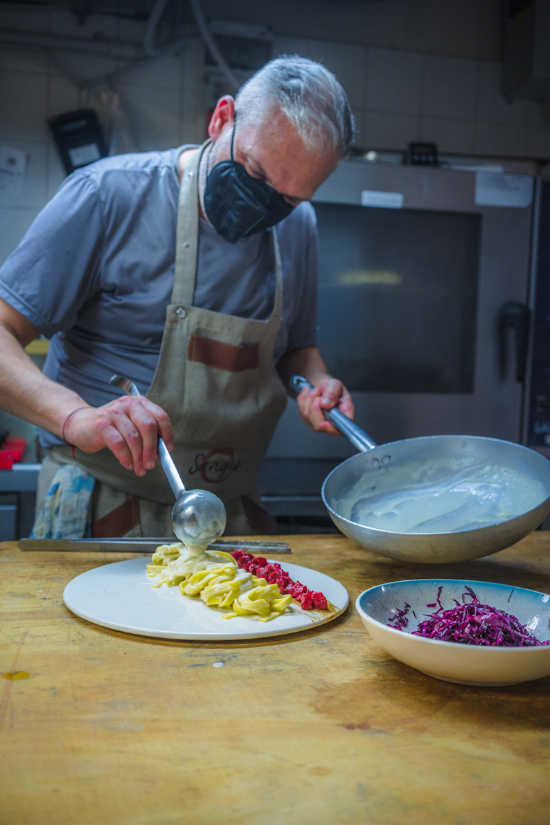 L’immagine del Sangiò Magna e Bè punta a trasmettere convivialità e tradizione, in cui il protagonista è la cucina: di alto livello, prende forma dalla maestria dei cuochi. Il lavoro svolto con loro negli anni ha dato vita a shooting completi, in cui la foto al piatto si unisce con la dinamicità del servizio. La sintonia creata con i proprietari ha permesso, inoltre, la creazione di scatti sempre più ricercati nel tempo per presentare i piatti.